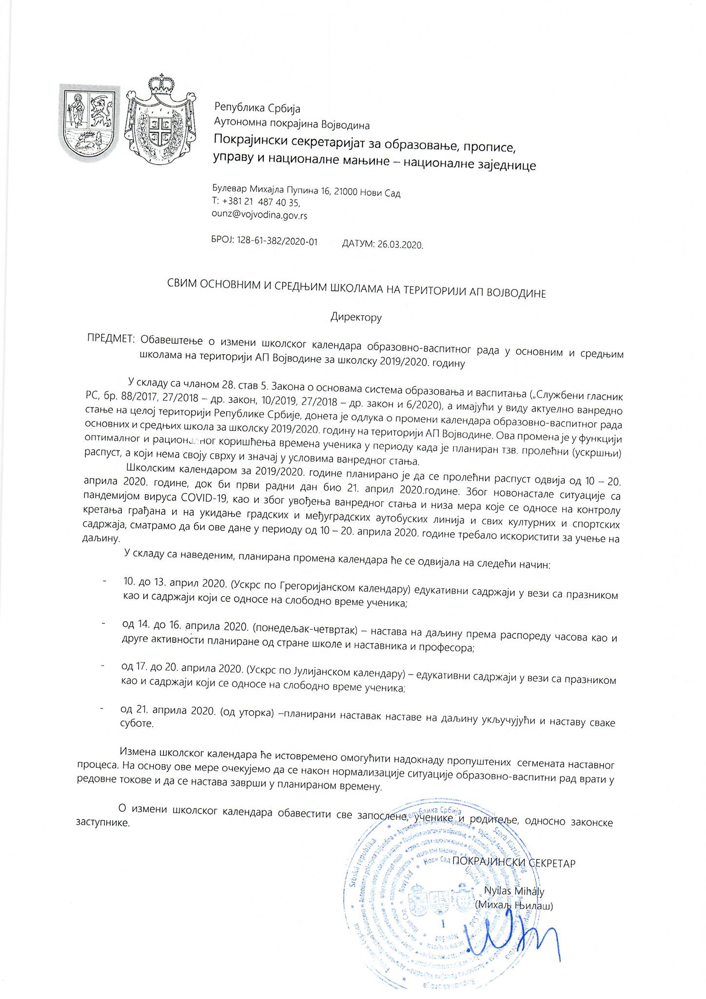 Обавештење 3- Измена школског календара