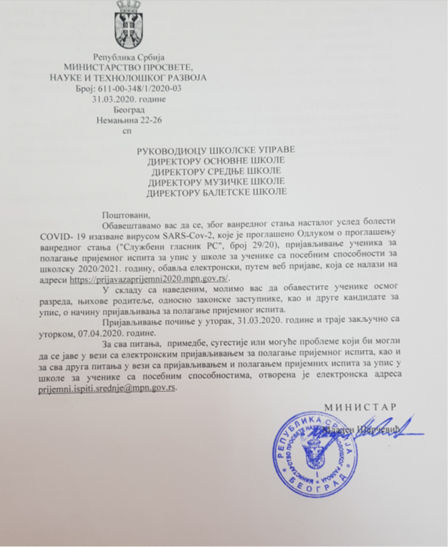 Обавештења Министарства просвете, науке и технолошког развоја